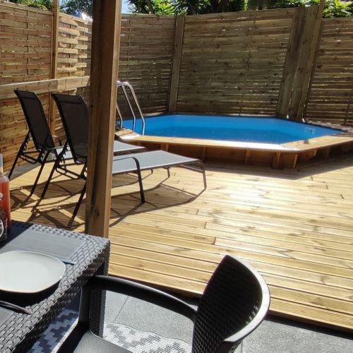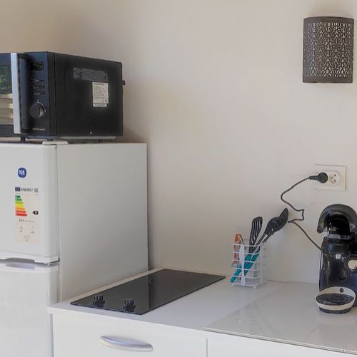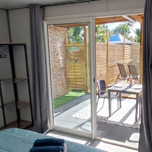 Chaque gîte dispose d'une chambre climatisée avec lit double en 160, salle de bain avec douche/wc, cuisine équipée sur la terrasse couverte avec table et chaises pour les repas et vue sur la piscine dans son prolongement. Parking intérieur.